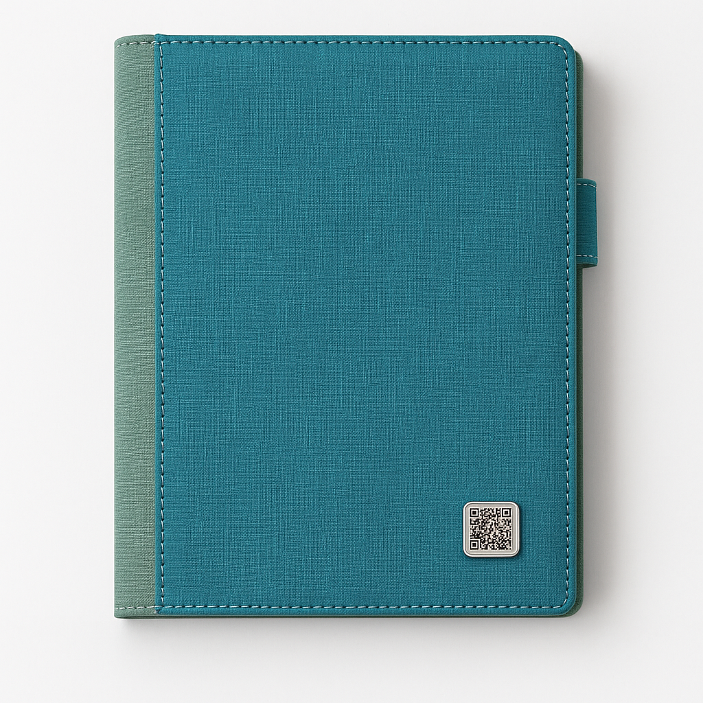 Stylish teal notebook with textured fabric cover, side pen loop, and a modern QR code detail for a unique touch.
