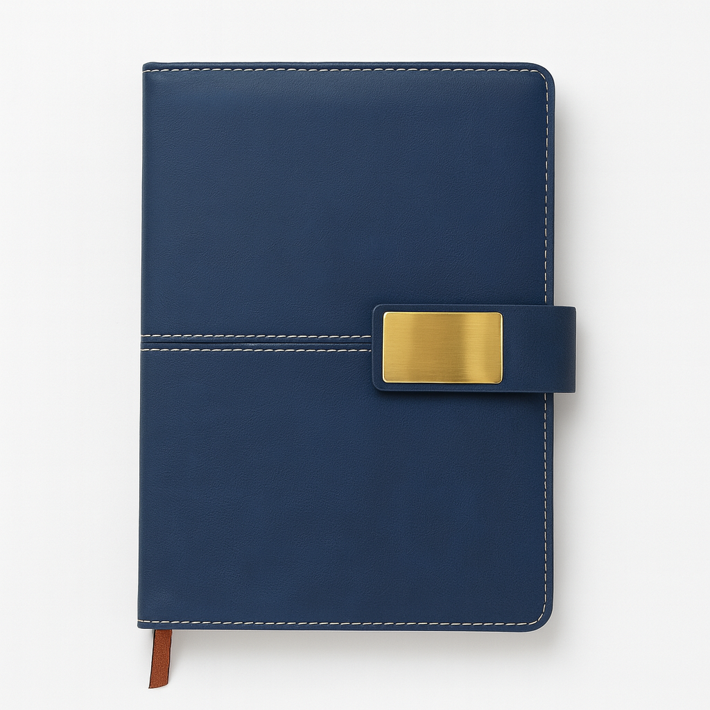 Elegant navy blue leather notebook with fine white stitching and a bold gold clasp, perfect for executives and professional meetings.