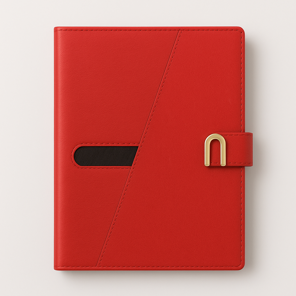 Elegant red notebook with a modern geometric design, secured with a golden buckle strap for a professional finish.