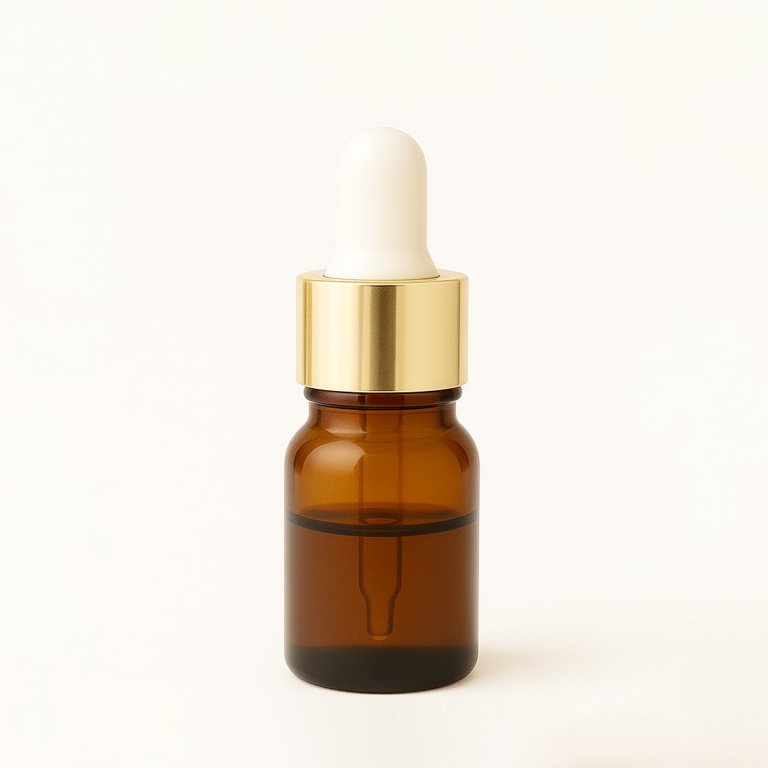 Amber glass dropper bottle with gold collar and white cap—ideal for cosmetics, serums, and promotional packaging.