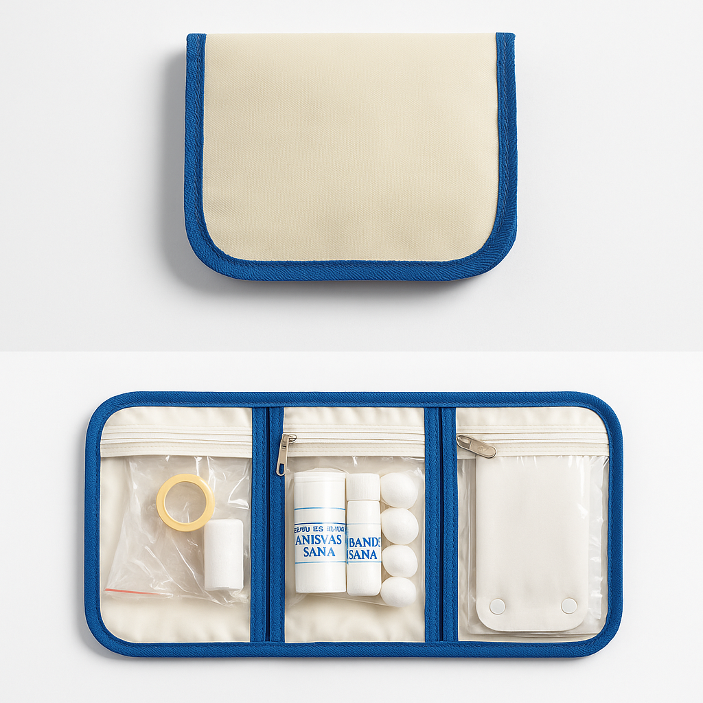 Portable first aid kit with organized compartments—ideal for travel, offices, and healthcare promotions.
