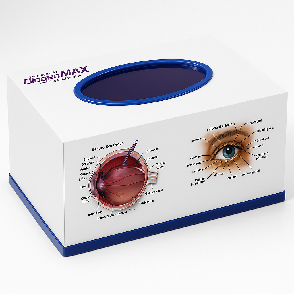 A rectangular tissue box decorated with detailed anatomical illustrations of the human eye, combining functionality with medical education.