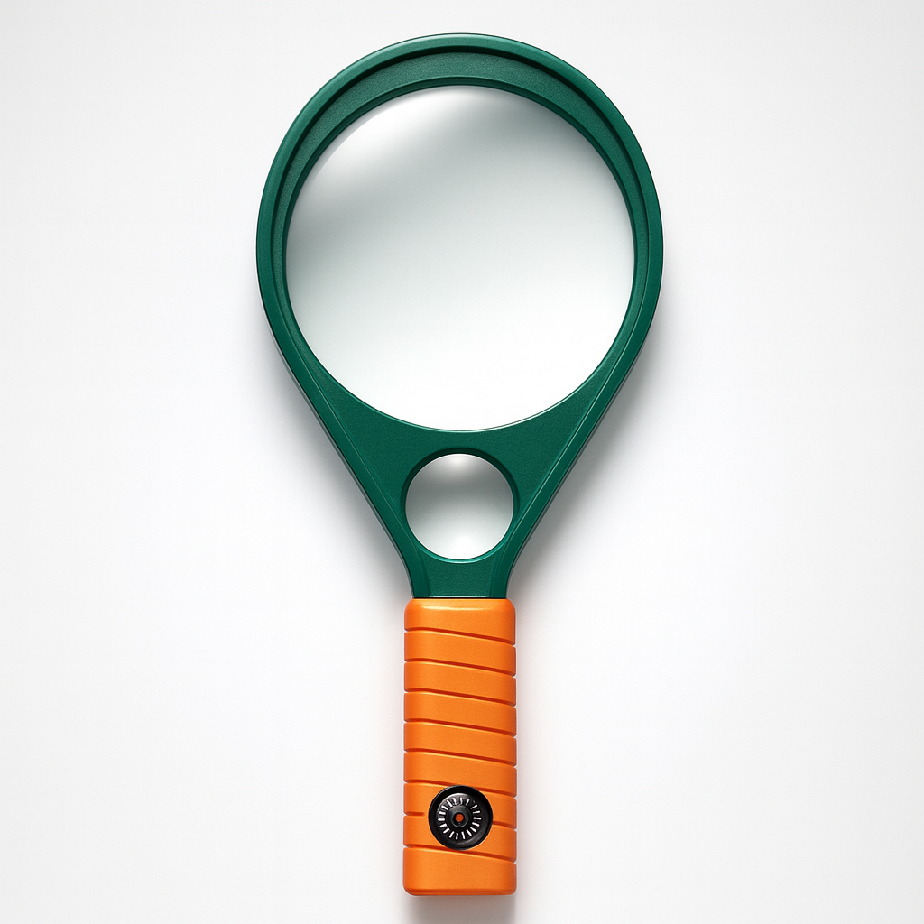 Durable magnifying glass with green frame and orange grip—ideal for education, inspection, and promotional gifts.