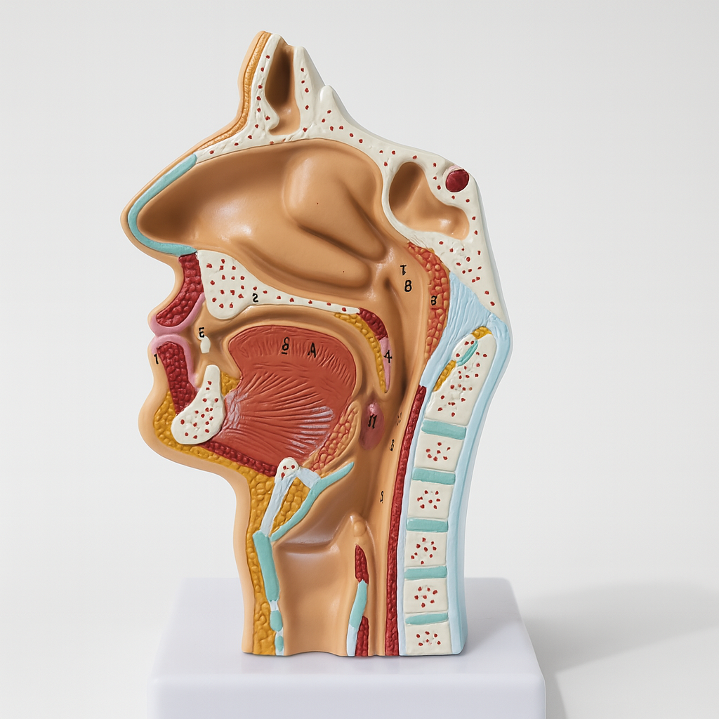 Detailed anatomical model showing a cross-section of the human head and neck for educational and medical demonstration purposes.