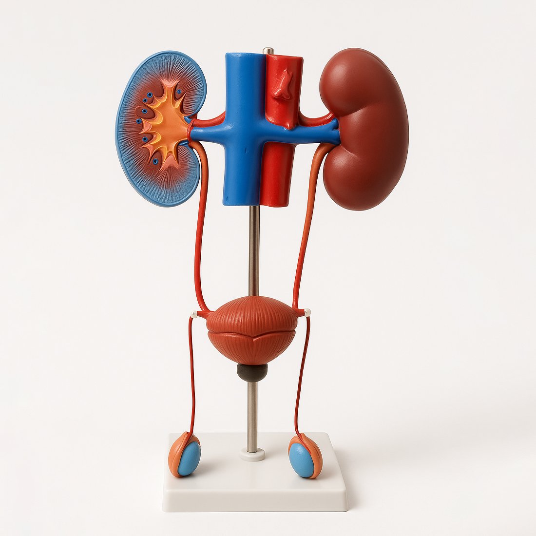 Detailed 3D anatomical model of the urinary system with kidneys, bladder, and related structures.