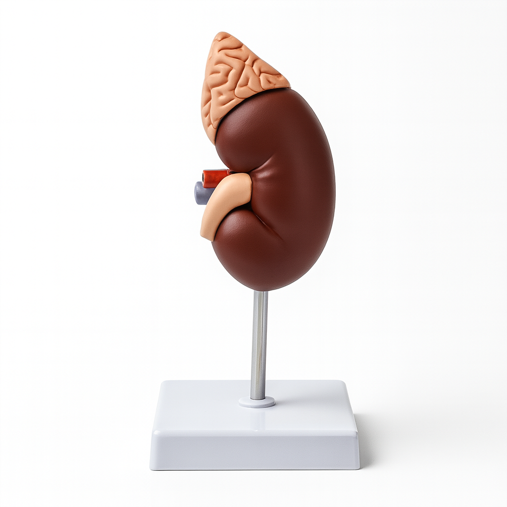Educational kidney model with adrenal gland, mounted on a stand for medical training and display.