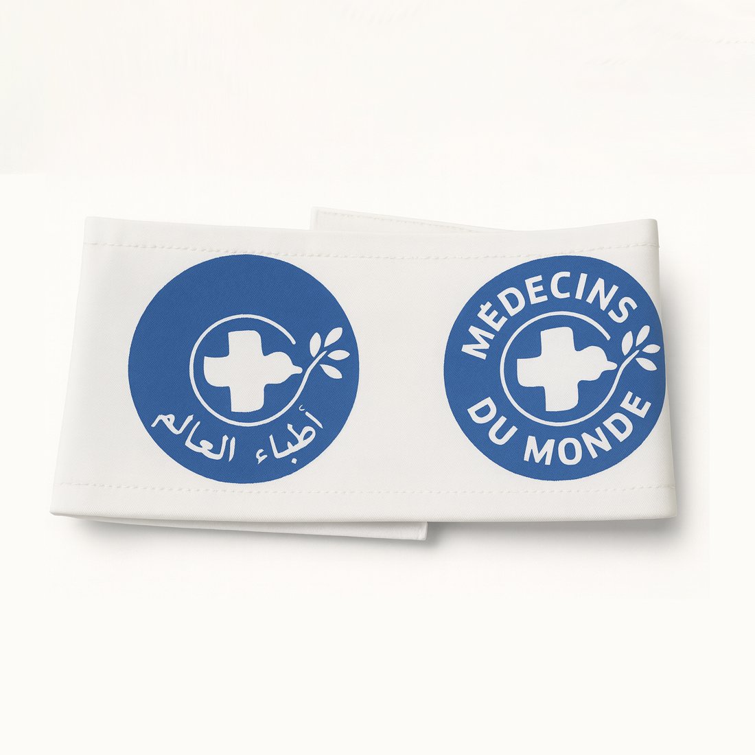 A white fabric armband with a printed medical logo, commonly worn by healthcare workers, volunteers, or humanitarian staff during fieldwork.