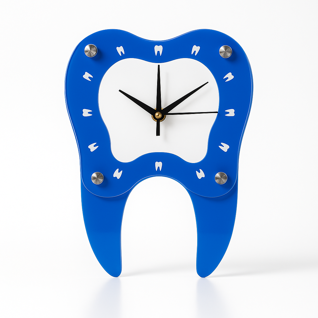 Creative dental-themed 39.5×25×2.5cm wall clock in a blue tooth design, featuring tooth icons as hour markers. Perfect for dental clinics and promotional gifts.