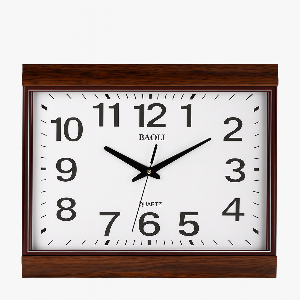 Elegant rectangular wall clock with a rich wooden frame, white dial, and bold black numerals, blending classic style with readability for any room décor.