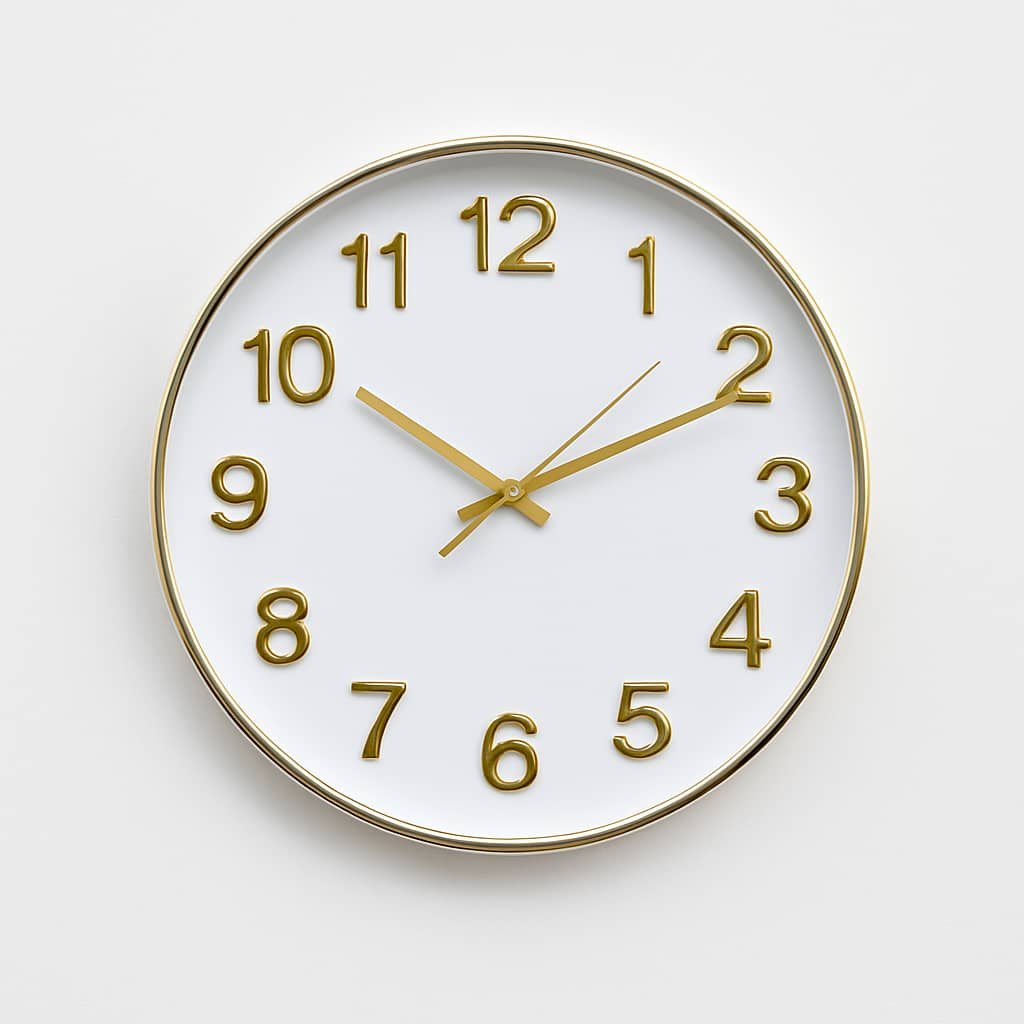 A round 30×30×4cm wall clock with a clean white face and gold-tone numbers and hands, designed to add a touch of sophistication to any space.