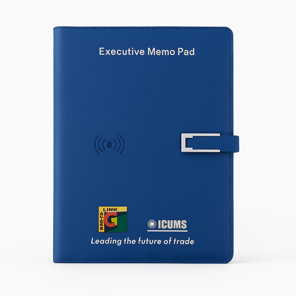 Smart Notebook with wireless charger on the cover and inner powerbank, as well as a USB flash drive ideal for professional and promotional use.