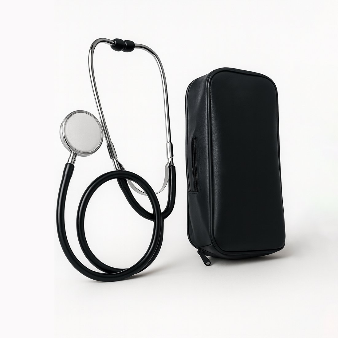 Professional stethoscope with durable black carrying case for doctors, nurses, and medical students.